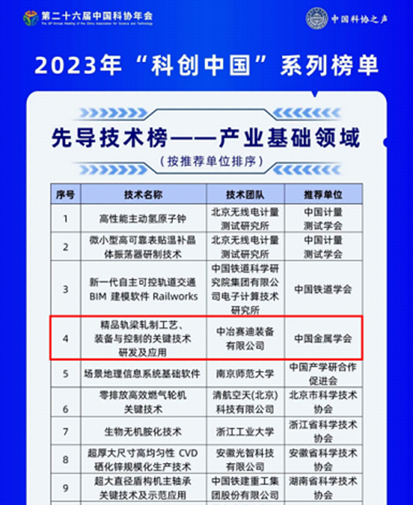 7月2日,中國科學技術協會正式發布2023年“科創中國”系列榜單,中冶賽迪“精品軌梁軋制工藝裝備與控制關鍵技術”上榜產業基礎領域先導技術榜單。